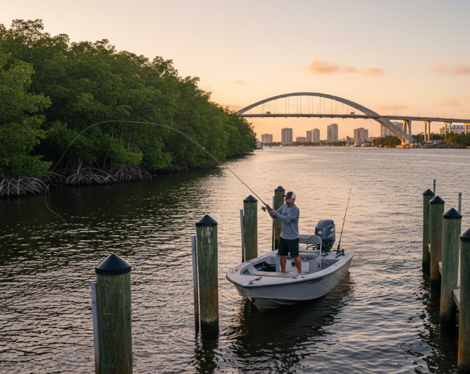 - Work the Shadow Line: Snook are ambush predators. When fishing bridge pilings or dock lights (especially at night), cast past the structure and retrieve your lure or bait right along the edge of the light’s shadow.