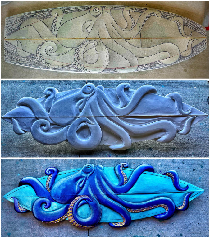 Once the core is exposed, the carving begins. Using various tools, Jones meticulously carves sea life directly into the foam. Common motifs include: